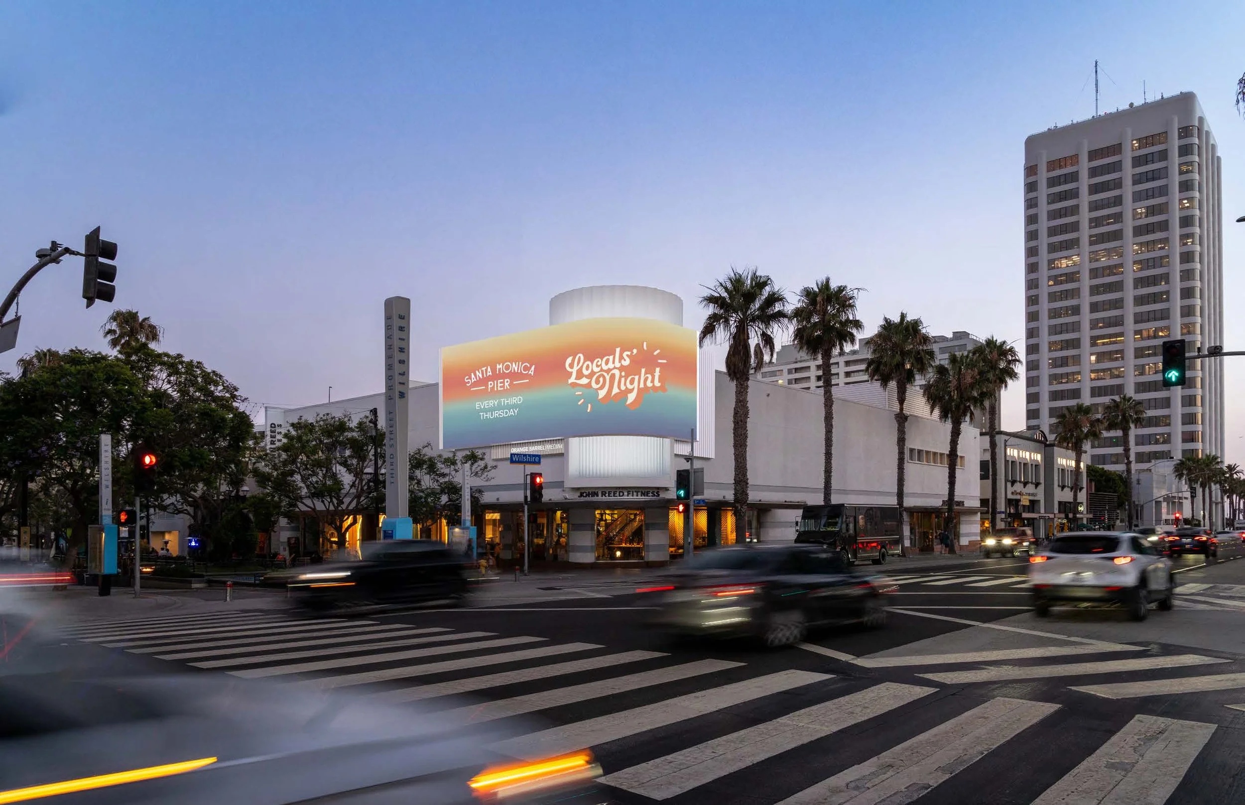 This project proposes a new, full motion, approximately 1,000 square foot LED digital display to be affixed to the facade of the existing commercial building to display paid advertising, artwork, civic announcements and content promoting the city, including the Third Street Promenade.